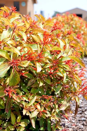 This flashy Firebush features bright green and yellow foliage with sizzling red-orange flowers from spring through fall. Upright spreader reaching 4 to 5 feet tall and wide. Perfect for creating a showy hedgerow or as an accent plant.