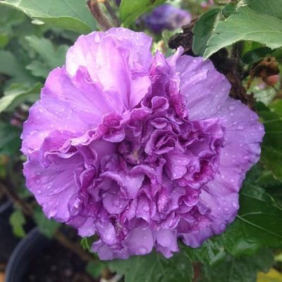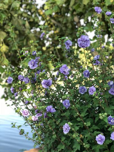 Beautiful double bluish-purple blooms adorn this medium sized shrub from mid to late summer. Matures at 8 feet tall by 4 feet wide growing upright with green serrated leaves.