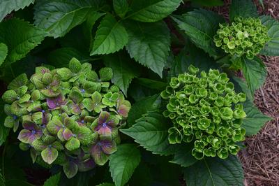 Unique mophead blooms that open green to green with pink spots, then finally more pink with greenish undertones and green foliage. Blooms begin in late spring and last well through the summer. Mature size is 3 to 4 feet tall and wide.