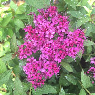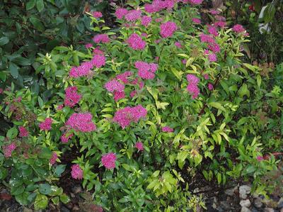 A dwarf Spiraea with clusters of deep red-pink blooms that contrast against blue-green foliage. A moderate grower, reaching 2 to 3 feet tall and 4 to 5 feet wide. Drought tolerant. Outstanding accent plant for color or contrast in foundation planting.